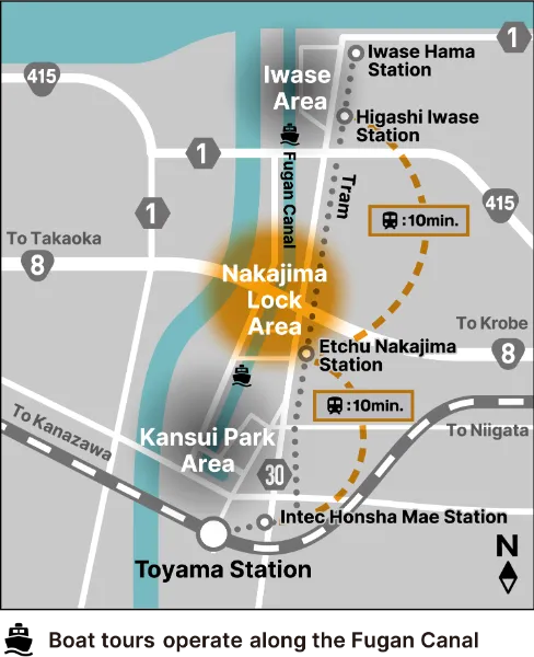 The Nakajima Lock is located at the midpoint of the Fugan Canal. The lock uses a Panama Canal-style lock-gate system to connect waterways that differ in height by 2.5 meters, making it possible for boats to sail between them. In 1998, the lock became the first civil engineering structure built after 1926 to be designated a national Important Cultural Property.The area contains three exhibition sites: the Nakajima Lock Control Room, the adjacent lawned plaza, and the former taxi company building known as Dentaku.