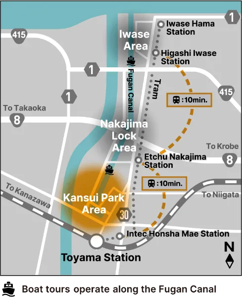 The Kansui Park Area is located in the heart of Toyama and offers majestic views of the distant Tateyama mountain range foregrounded by the waters of the Fugan Canal. The area contains three exhibition sites: the Rakusuitei Museum of Art, which features works in clay; the Fugan Canal Kansui Park, which features a large-scale outdoor installation piece; and the Toyama Prefectural Museum of Art and Design, which features wearable works of soft sculpture. The Kansui Park is the starting point for the exhibition. Visitors can board tour boats bound for the Nakajima Lock and Iwase Areas to embark on a journey down the canal.